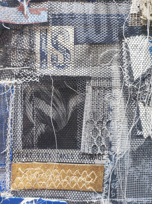IN LA P OUBELLE zijn restjes uit mijn eigen prullenbak samengebracht tot een nieuwe, zorgvuldig opgebouwde compositie. Snippers papier, textiel, plastics, draad en kant worden tot één geheel gestikt op een transparante drager met een subtiele blauw-zilveren gloed.